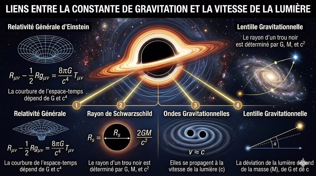 Le lien le plus explicite et le plus puissant entre G et c est formulé dans les équations du champ d’Einstein, publiées en 1915. Ces équations constituent le socle de la relativité générale et décrivent comment la matière et l’énergie courbent l’espace-temps. La relation fondamentale s’écrit :